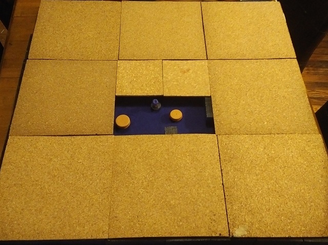 Now we cover the lowest level with 12"x12" cork tiles. The way down is an open
