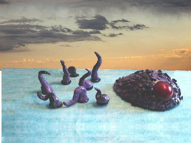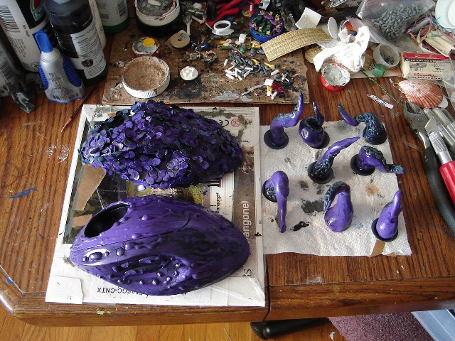 Here is a coat of purple over the metallic blue base coat. I left the suckers blue. Next will be little drybrushing with a sickly organic pink to heighten the details.