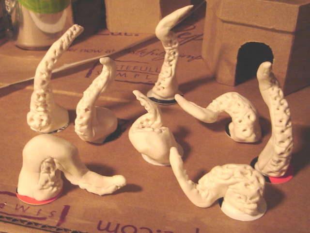 These guys will need some tentacles, no? Yes. Good! I made these from Crayola Model Magic clay. You can see the bases above, with some floral wire supports. The supports are key to give support (duh!) and to guide your tentacle making. You really want these to free stand on their own without falling. You can do a finite element analysis to find the center of mass of your designs, fight with a lot of trial and error, or use heavy counter weights (fender washers) as bases. I did finite element analysis. No really.