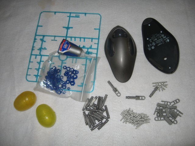 plastic easter eggs, K'Nex pieces. Gears made by slicing up Super Glue caps, and